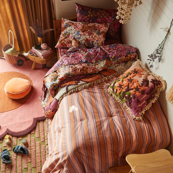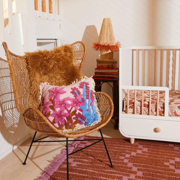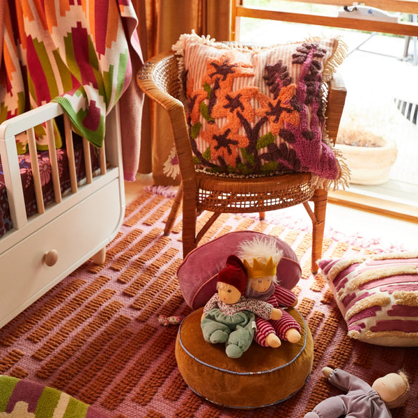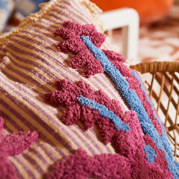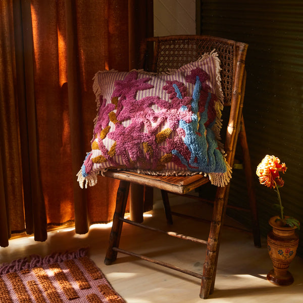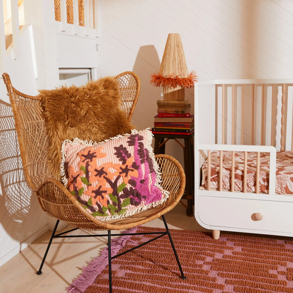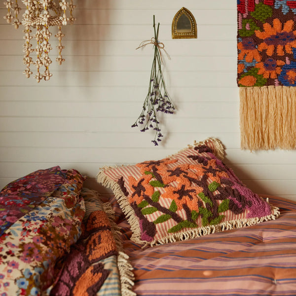 “Spice tone colours and maximalist patterns are the stars of the show in our Sara Cushion. Floral-printed cotton brings a delicate botanical feel, contrasted by a geometric take on flower motifs – tufted by hand to deliver lush, touchable texture.” – Phoebe’s Style Notes