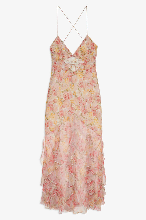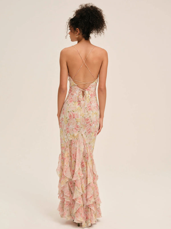 Embrace summer romance with the Elea floral maxi dress–an ultra-feminine floral printed ruffle maxi dress with a cascading ruffled skirt and a low open back with functional ties.
