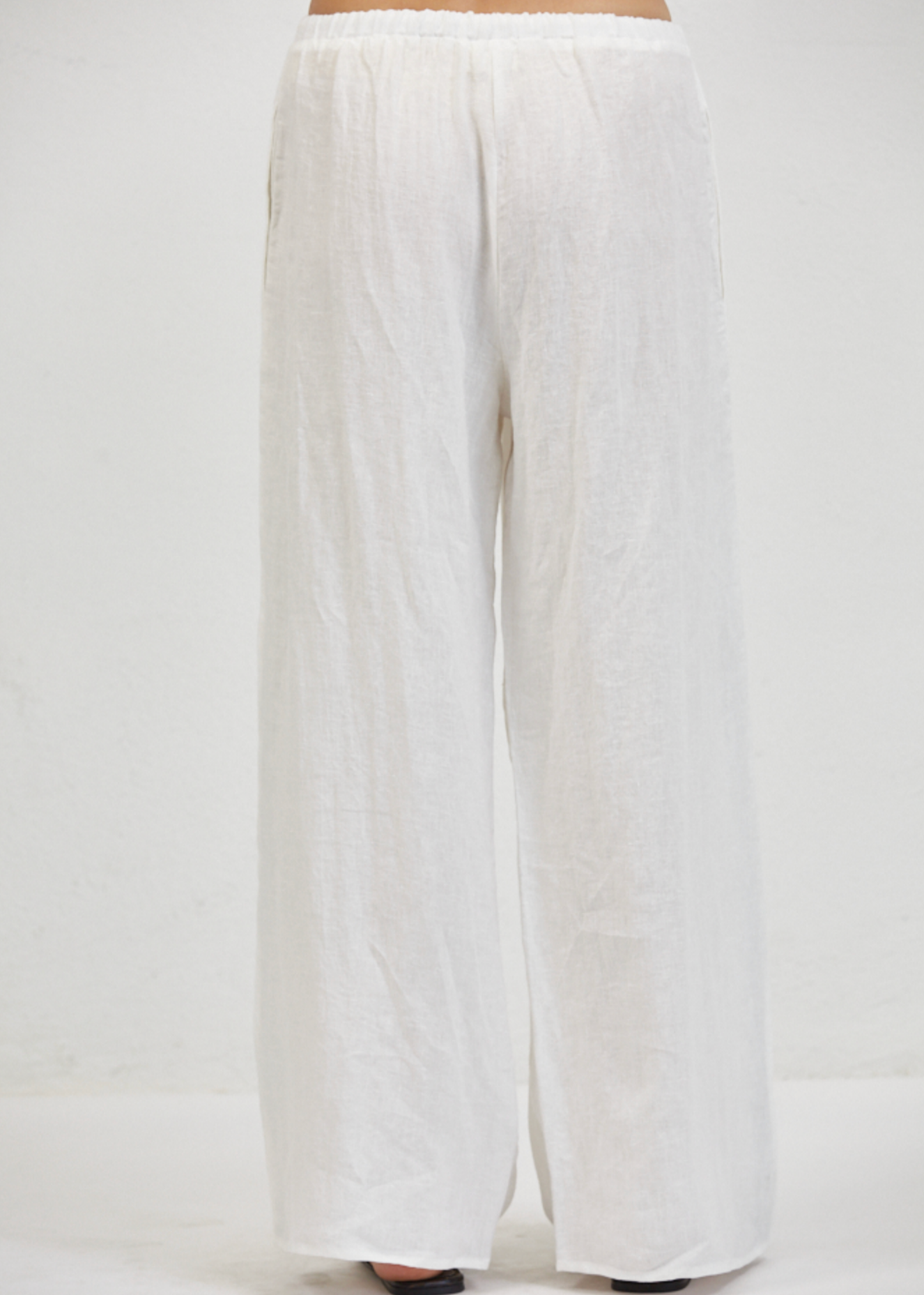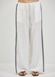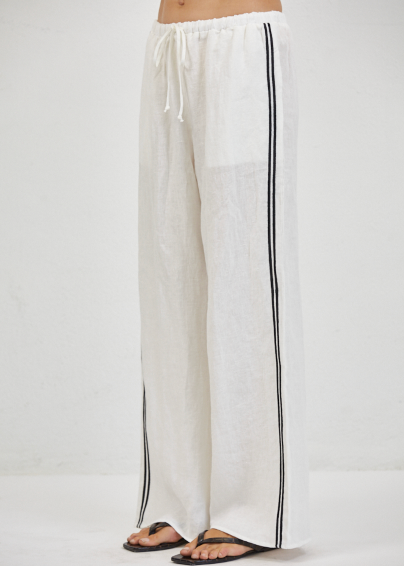 These Palazzo Side Striped Linen Pants feature a white linen fabric with black embroidered double stripes running down the sides. Designed with a comfortable drawstring waist and practical pockets, they offer a relaxed fit ideal for everyday wear.