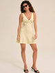 Featured in butter yellow—the hue of the summer—the Sunrise Mini Dress is cut to a deep "V" neckline and crafted with pretty inset appliqués. Wear this slip dress to all your sunset soirées.