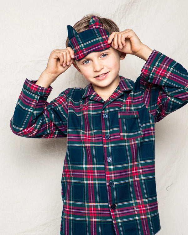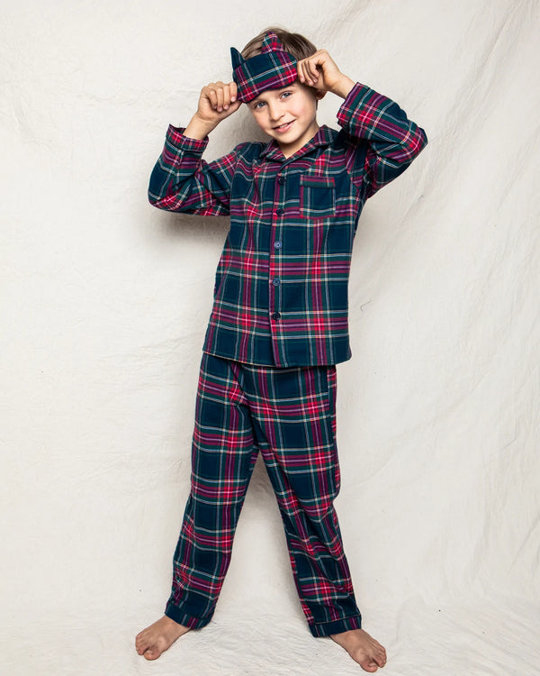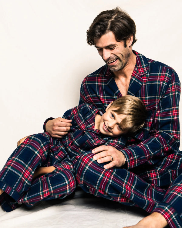 A true classic. Primary notes of deep blue with ribbons of rich red and emerald green. Together the Windsor palette suggests crisp, snowy mornings and cozy evenings around a stone fireplace. The lightweight soft flannel classic pajama set is accented with navy piping and finished with pearl buttons.