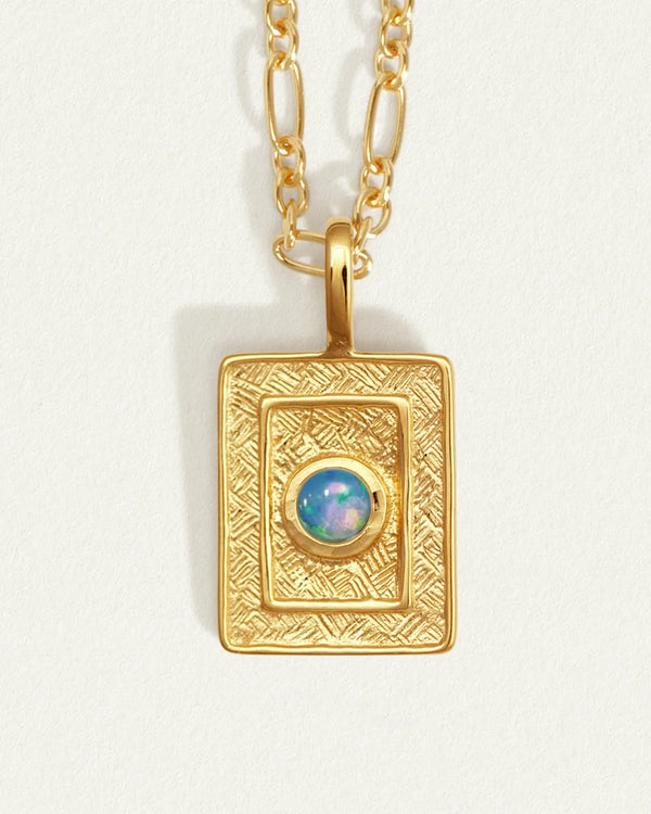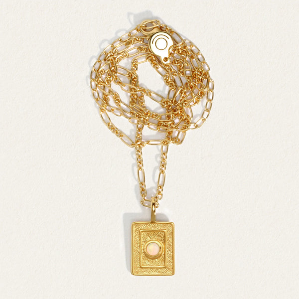 The Agora Necklace is an opal necklace set into a textural pendant of 18k gold vermeil with a figaro chain. In Classical Greece, the agora served as the social, spiritual, political, and academic heart of the city. An open space for citizens to mingle and ideas to form. The birthplace of democracy itself.