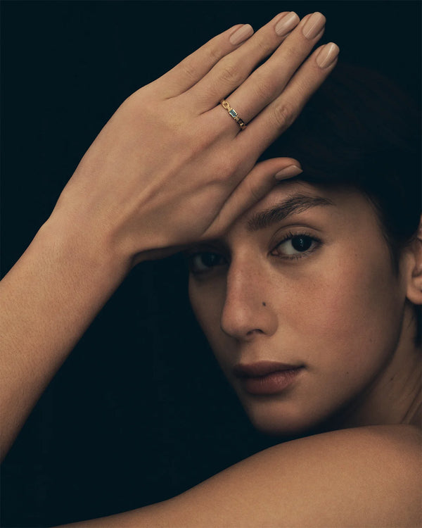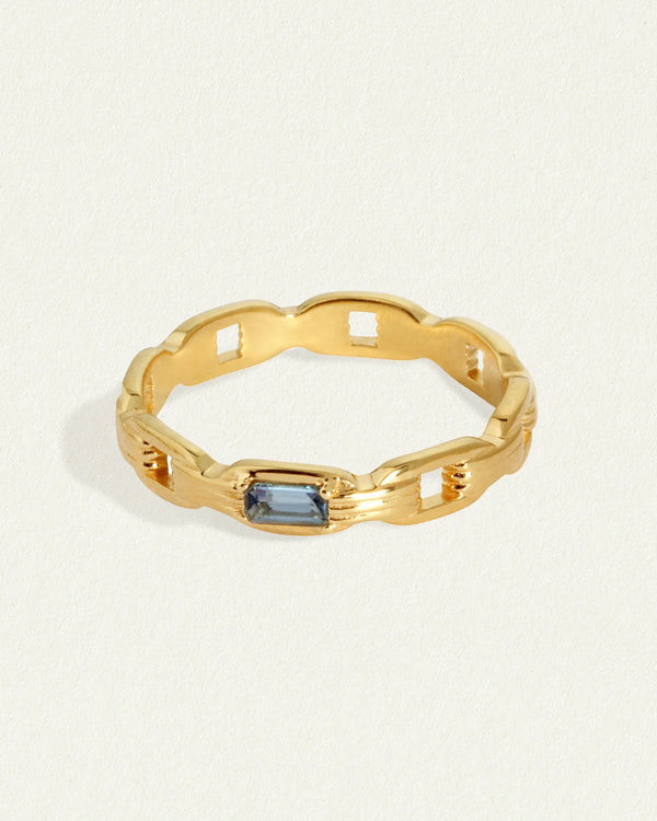 Throughout the ages, the Sun and the Moon have been used as symbols of the masculine and feminine principles as an expression of polarity. They have been mystically represented as deities, or as a Solar King and a Lunar Queen. The Vesta Ring in tumbled 18K Gold Vermeil has three delicate Sapphires that guide us with their wisdom and bring the energy of the Sun and Moon into our daily practices.