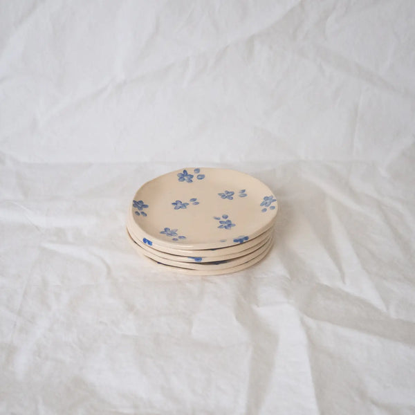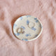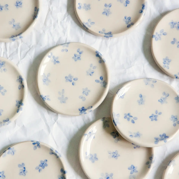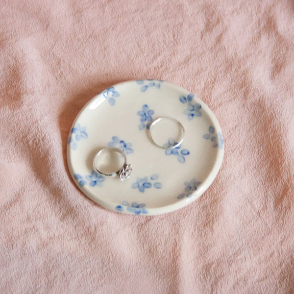 Ceramic ring dish perfect for rings and favorite small jewelry items. Hand sculpted with a creamy white stoneware clay and painted with blue forget me not