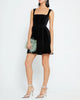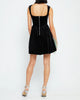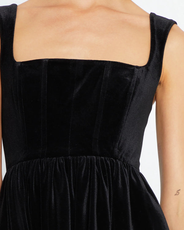 The boned bodice creates a beautiful structured effect on this little black dress. The black velvet material and silver zipper detail creates an elegant feel.