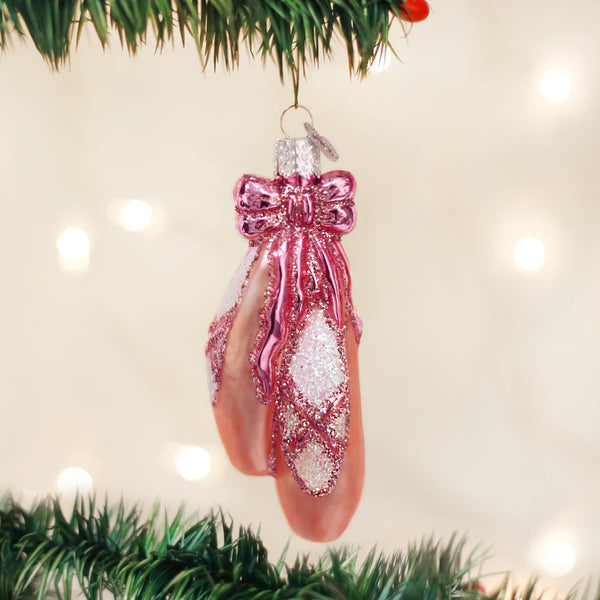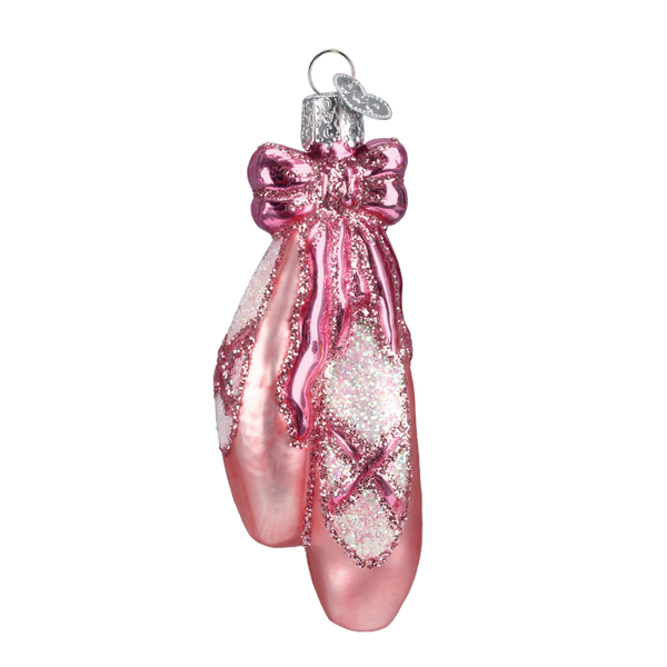 A pair of delicate pink ballet slippers tied with glittering ribbons, capturing the grace and beauty of dance. A lovely keepsake for dancers and dreamers alike.