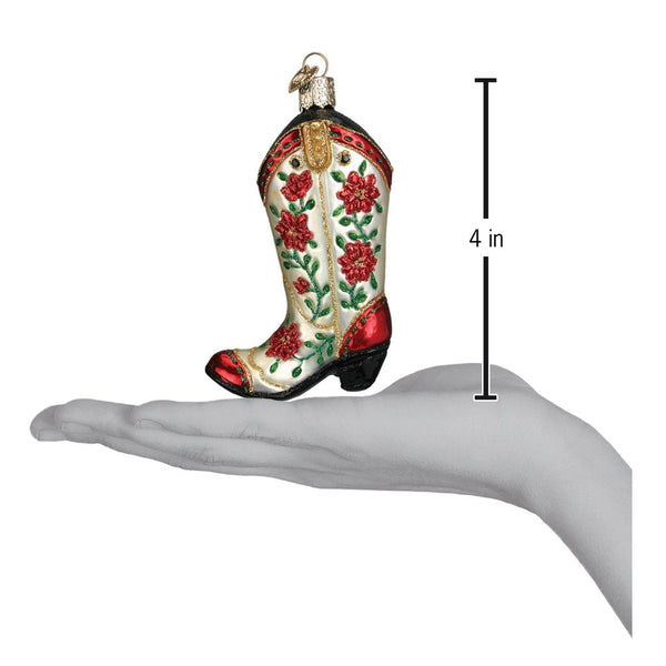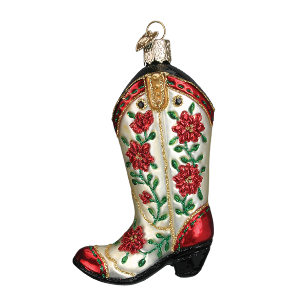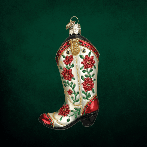 A festive cowgirl boot decked out in glitter and holiday cheer. Perfect for those who love a little sparkle, adventure, and Western charm on their tree.