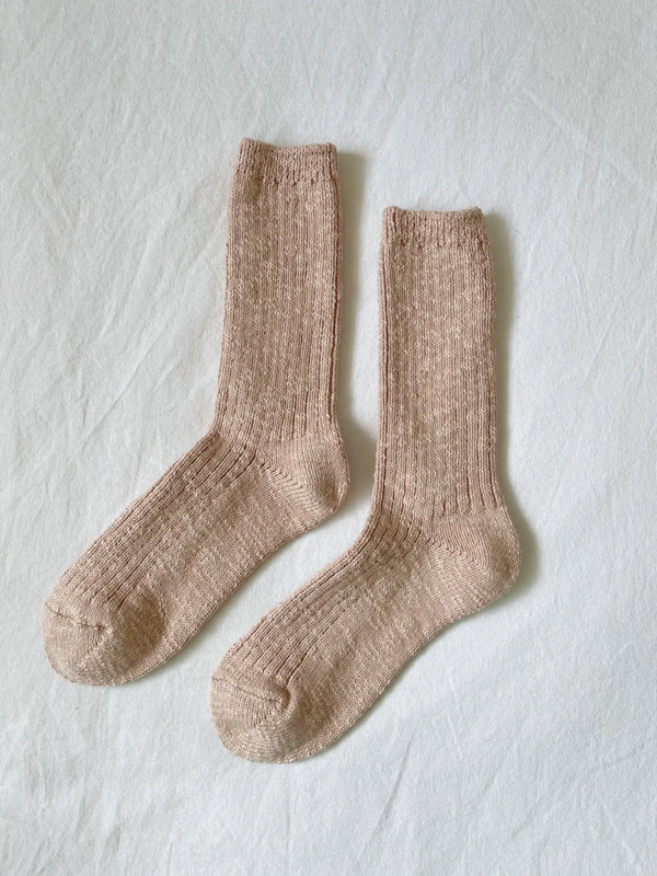 We were dreaming of a chunky, beautiful knit sock that felt effortless and romantically rustic. The rich texture, faded color palette, thick ribbing and organic scrunching of Cottage Socks invites feelings of wabi sabi and slowing living. These natural, cotton blend socks loves to be worn with vintage florals and tonal layers of luxurious natural fibers.