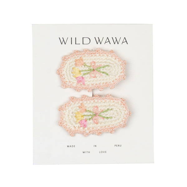 - Set of two hand-crocheted clips with hand-embroidered bouquet details