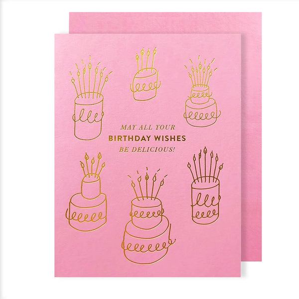 Greeting: "May All Your Birthday Wishes Be Delicious" (Blank Inside) Printing: Gold Foil Card size: 5.5" x 4.25", Folded Paper: thick colored stock with coordinating A2 envelope