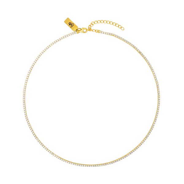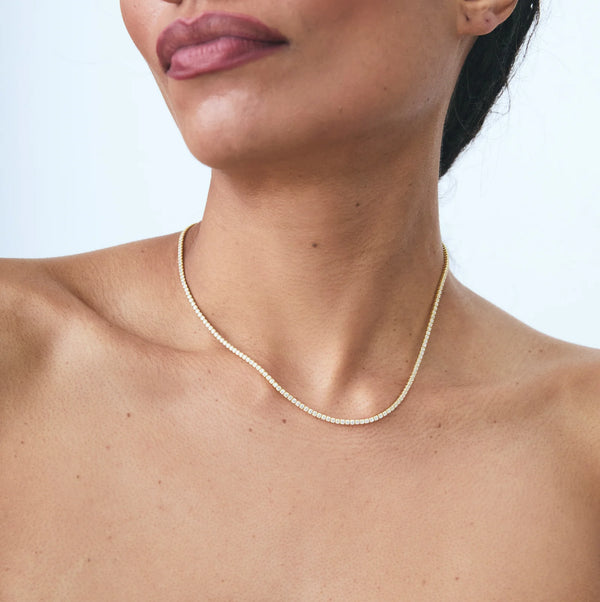 Our stunning Diana tennis necklace features a sparkling array of 1.75mm cubic zirconia stones to add a luxe touch to any outfit. Style it alone or stacked with our chain necklaces.