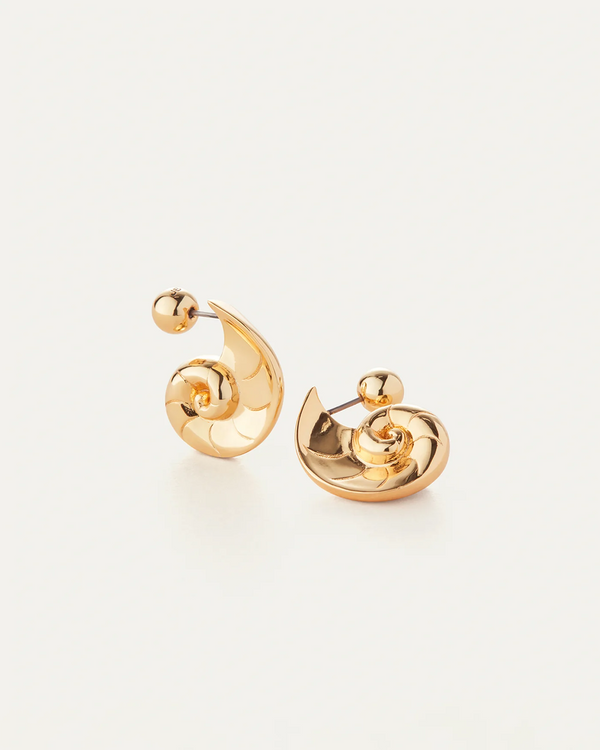 A pair of nautilus earrings, capturing the beauty of the shell in profile. These can be worn two ways; showcasing the interior or exterior of the shell closest to your face. Finished in high-polish gold.