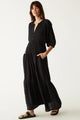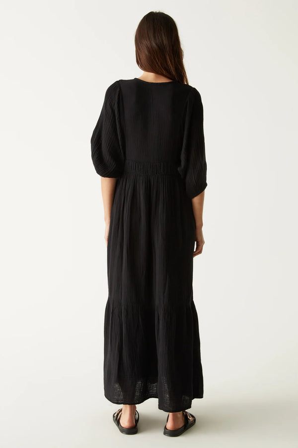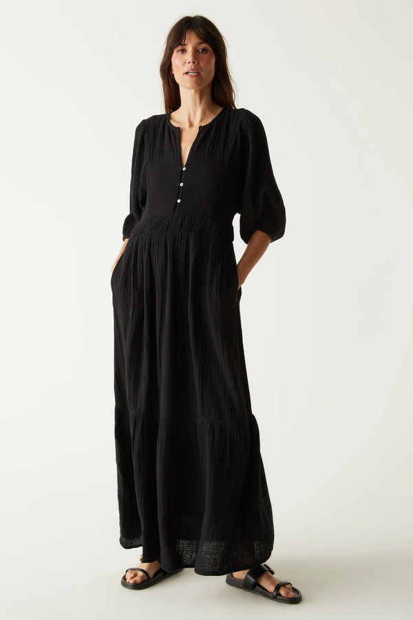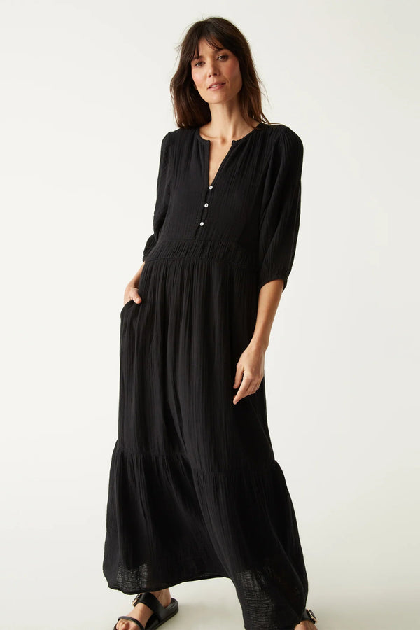 The Felicity maxi dress is fully lined with a tiered skirt, button front, and elasticated 3/4 sleeves. Made from our 100% cotton Double Gauze fabric that’s light & airy – perfect for travel.