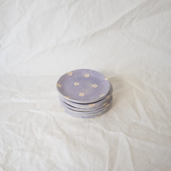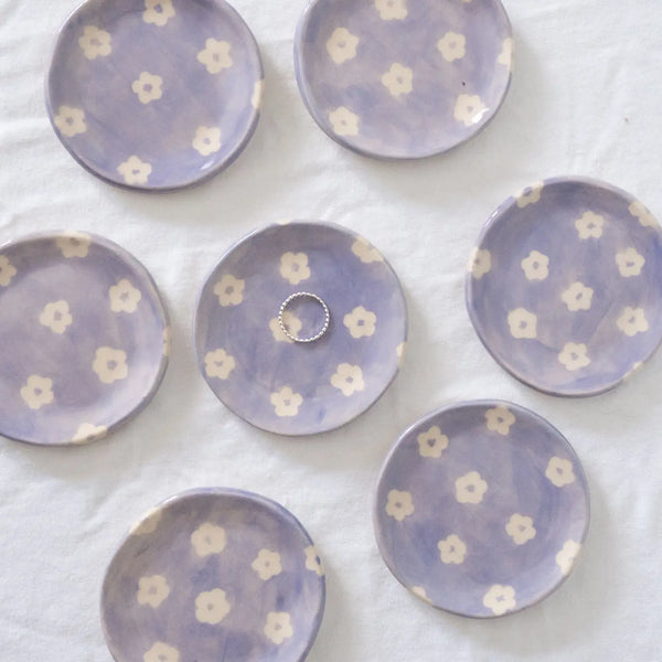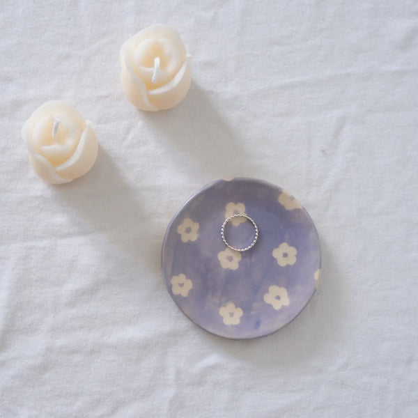 Ceramic ring dish perfect for rings and favorite small jewelry items. Hand sculpted with a creamy white stoneware clay and painted in a lavender petunia pattern