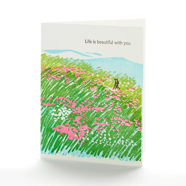 100% cotton paper, white Folded A2, 5.5 x 4.25 inches Blank interior Comes with a white A2 envelope Packaged in a clear biodegradable sleeve