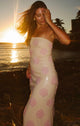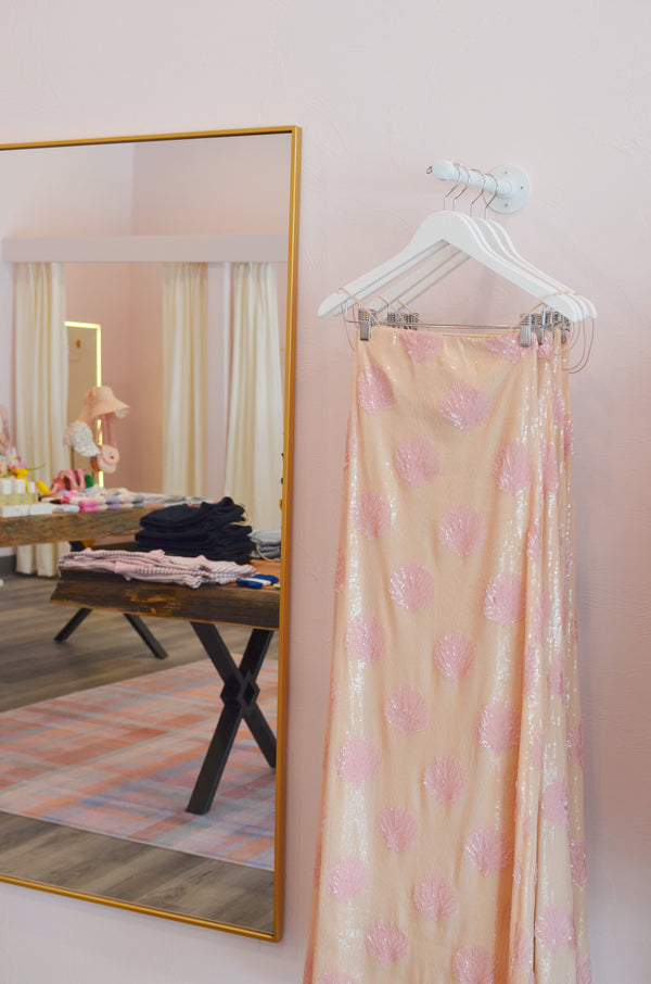 The Lizzy Dress brings all the seaside sparkle! Covered in shimmering sequins with a playful pink seashell pattern, this stunner is made for dancing under the cabana lights. With elastic spaghetti straps for support and a built-in shelf bra it’s equal parts comfy as it is eye-catching. Just add platform sandals and a cute clutch, and you’re set to shine!