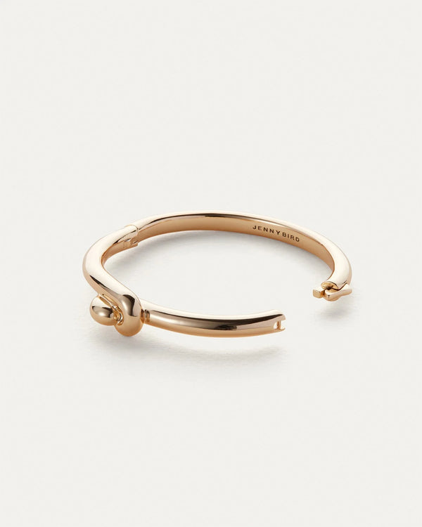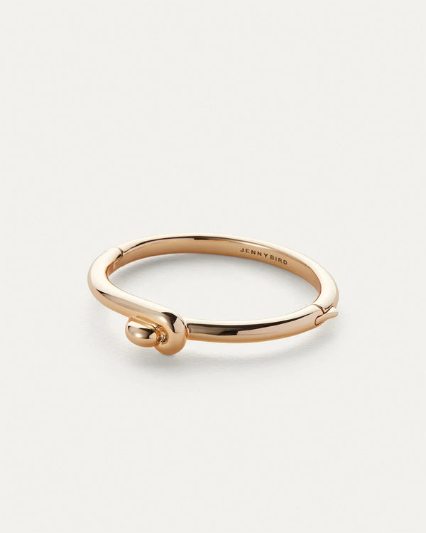 An elevated knot anchors this tubular bangle, adding fluid texture to your arm stack. This custom bangle opens and closes with a hinge and tab lock closure. To open, push down on the highest point of the clasp before pulling the bangle open. To close, listen for a "click" to ensure tab is locked properly. If you're looking for something more tubular, try the Gia Bangle. Note: this design wears best when the closure is secured on the inside of your wrist. Finished in high-polish gold.