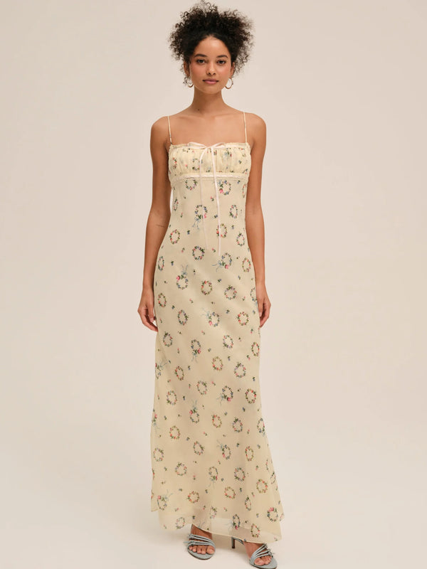 Perfect for warm summer soireés, The Midsummer butter yellow maxi dress is cut on the bias for a flattering fit and rendered in a sweet floral wreath bow print. Adorned with slotted lace ribbon trim, a ruched bust, and decorative center-front bow—this yellow slip dress makes for the perfect summer occasion dress.