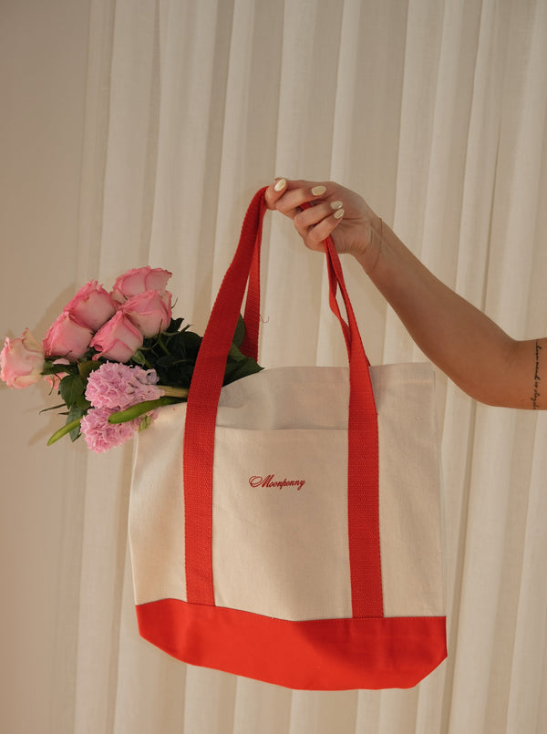 Our Moonpenny Market Tote is a durable 100% cotton canvas companion designed for summer days, farmers market hauls, and lugging your life around! Crafted in the USA, this tote features a wide base, sturdy structured side seams, and a front pocket for your phone.