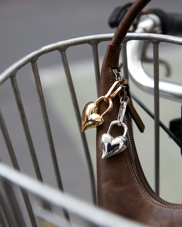A luminous heart shaped padlock dangles from a small carabiner hook. Accessorize your bags, belt loops and more with this playful charm. Finished in high-polish gold.