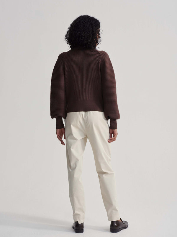 Modern, directional rib detailing and voluminous balloon sleeves define the Reid half-zip knit. Made in our Soft Rib Knit, this statement half-zip pullover draws inspiration from the Carmen with a boxy silhouette. Balloon sleeves and a directional rib pattern elevate the design.
