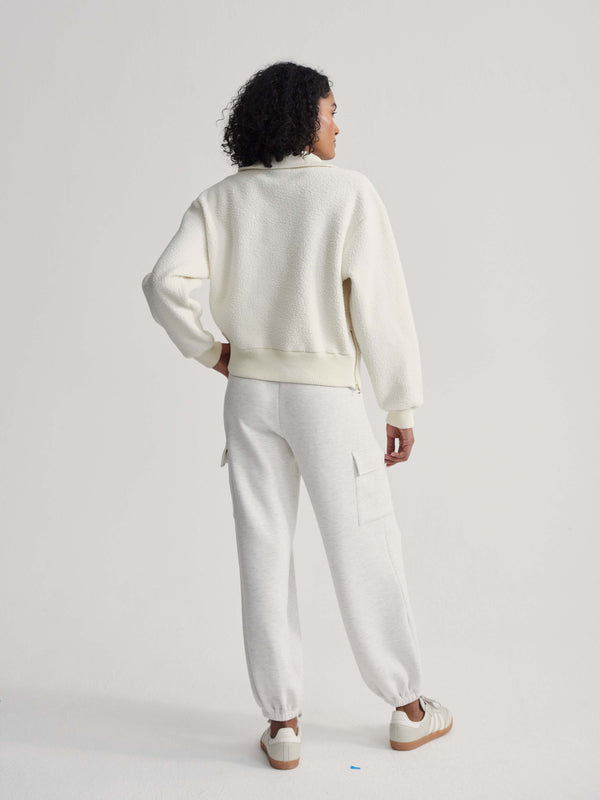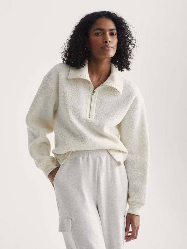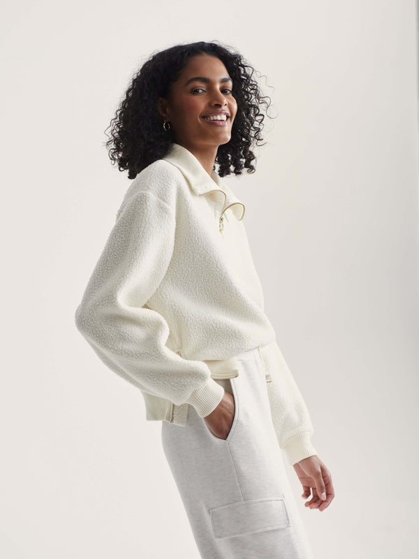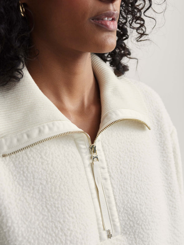 Spotlighting our 100% Recycled Plush Borg Fleece, this style is cut with a half-zip collar, ribbed cuffs and loose fit sleeves. Trademark side zip detailing and a luxe sateen trim elevate the design.