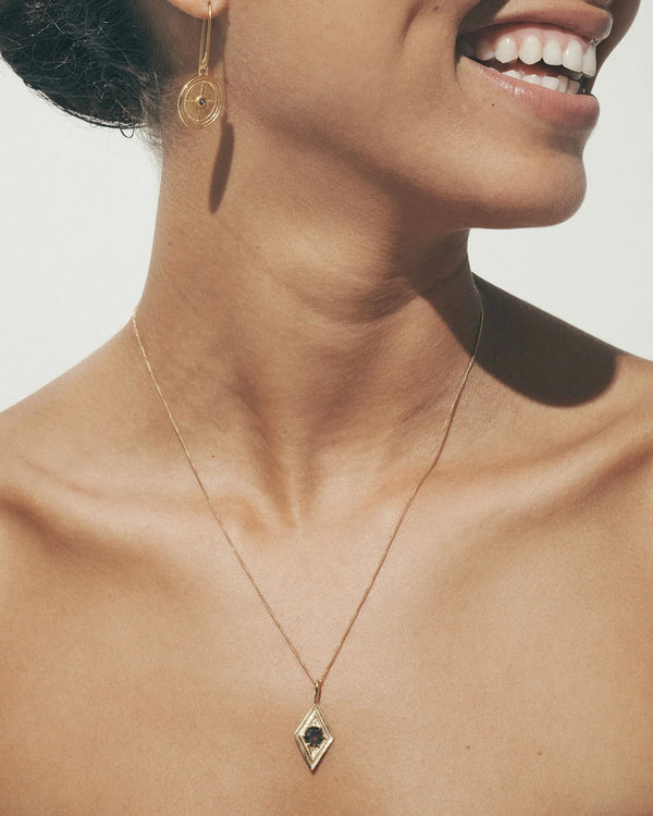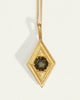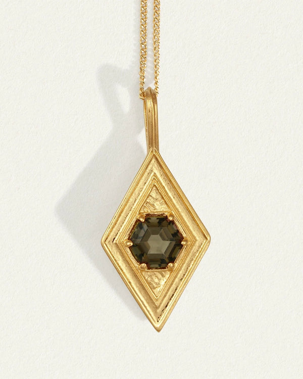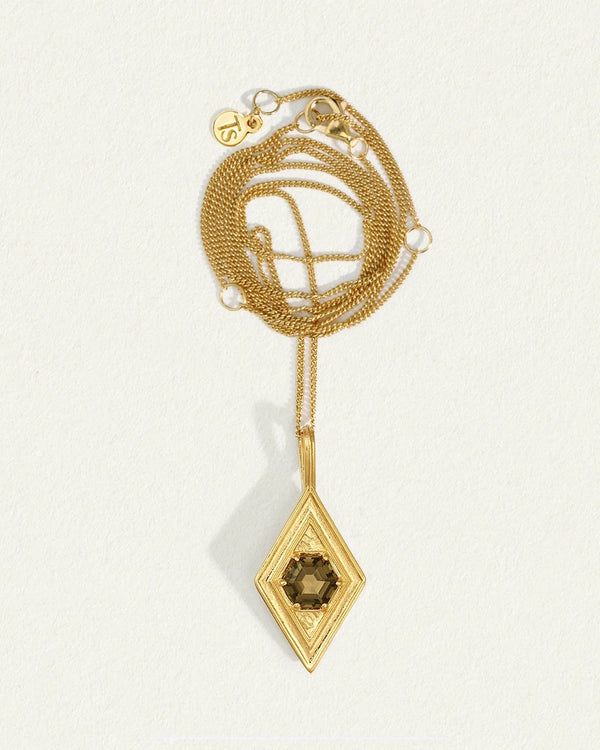 The Sarruma Necklace is an 18k Gold Vermeil celebration of sacred geometry. The additional length of the curb chain supports the dramatic interplay between the kite-shaped pendant and the hexagon gemstone at its core. Glimmering facets of the Smoky Quartz dominate the pendant, drawing us inexorably into its honeycomb depths.