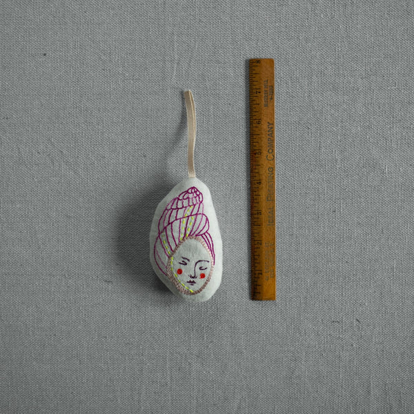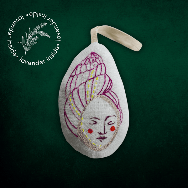 Skippyu Cotton's signature lavender-scented ornaments are a lovely gift for any time of year. Perfect for gift toppers, closet or drawer sachets, holiday ornaments, or year-round décor. Each scented ornament is hand illustrated and embroidered using vibrant polyester threads on assorted linens. Each ornament is hand cut, turned, and stuffed with organic cotton and lavender. Natural twill tape is placed on top for hanging.