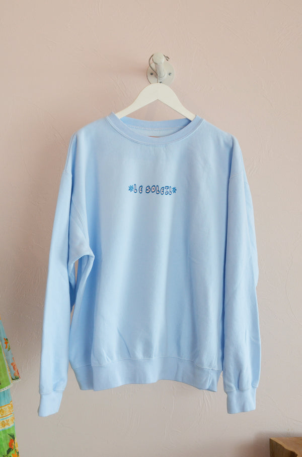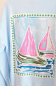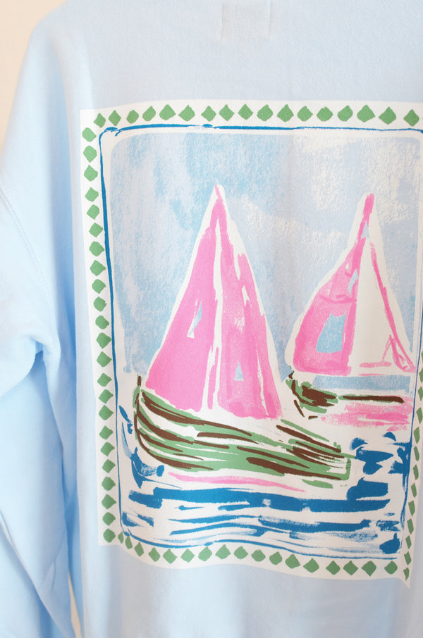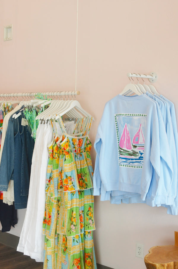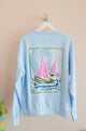 An oversized soft as butter crew neck sweatshirt from Show Me Your Mumu! Features a sailboat graphic on back and ‘Le Soleil’ on front.