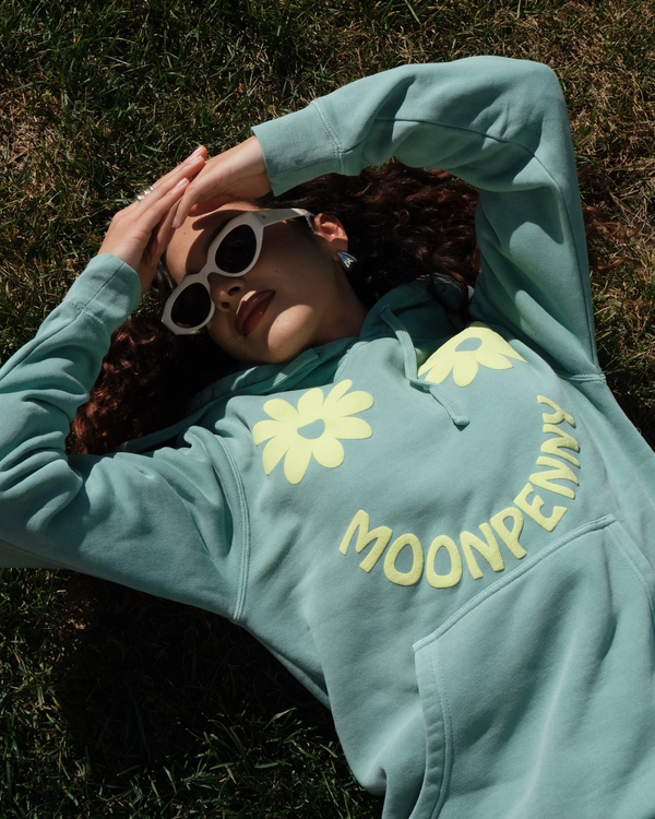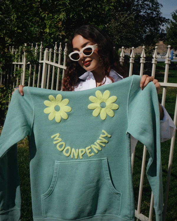 The Moonpenny Daisy face is now featured on the softest sweatshirt you've ever owned! A vintage green color way with our logo face in lime puff screen printing. A fun happy piece to keep you warm!
