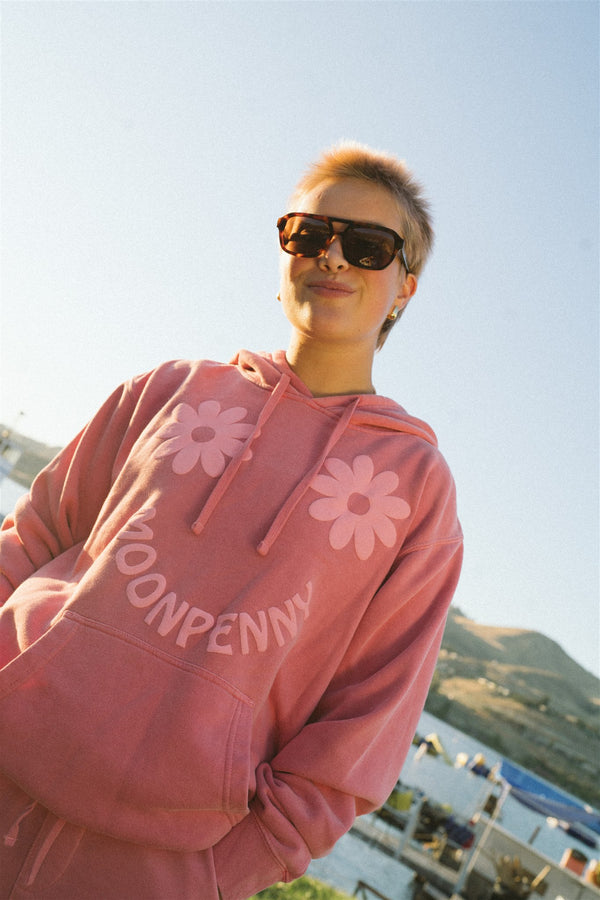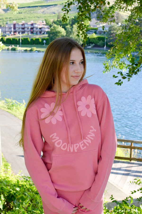 The Moonpenny Daisy face is now featured on the softest sweatshirt you've ever owned! A Guava Pink color way with our logo face. A fun happy piece to keep you warm!