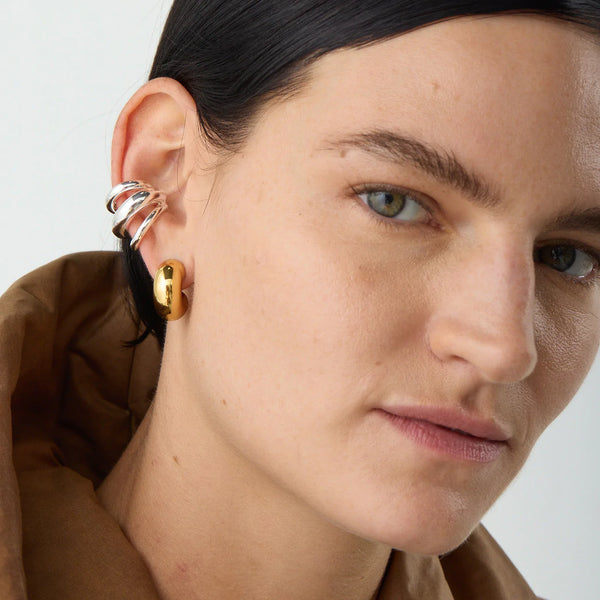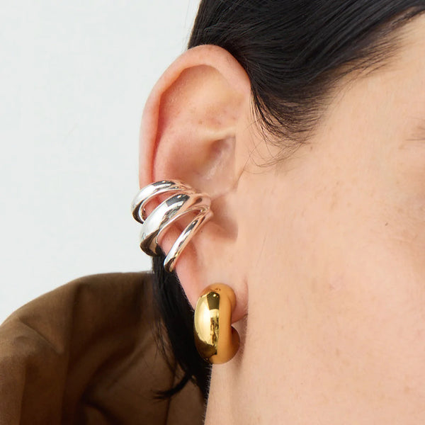 A statement-making ear cuff with rounded ends. The Tome Triple Ear Cuff is solid, so you won't be able to squeeze it into place. To wear, position at the thinnest part of your ear, pushing over the edge so it hooks inside. Once it feels secure, wiggle to adjust in place. Finished in high-polish silver.