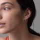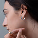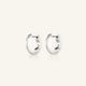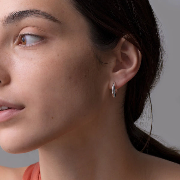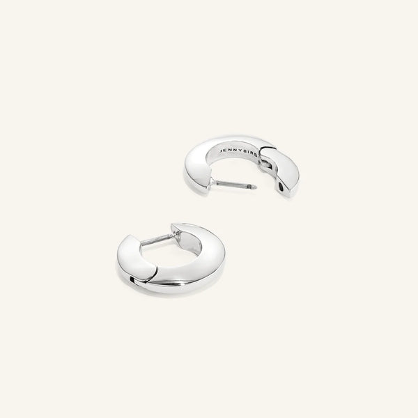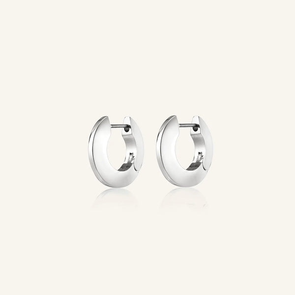 A custom, perfectly circular, small modern hoop. Opens and closes with a hinge. Pull at back hinge to open. Push to lock onto post and listen for a "click" to ensure it's locked properly. Dipped in silver with a high polish.