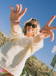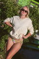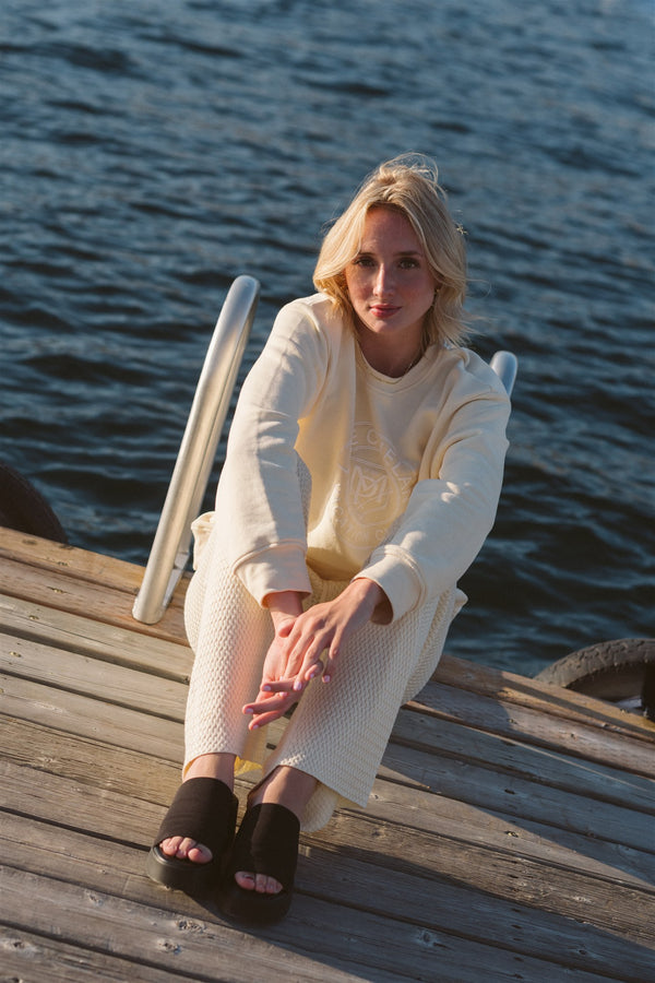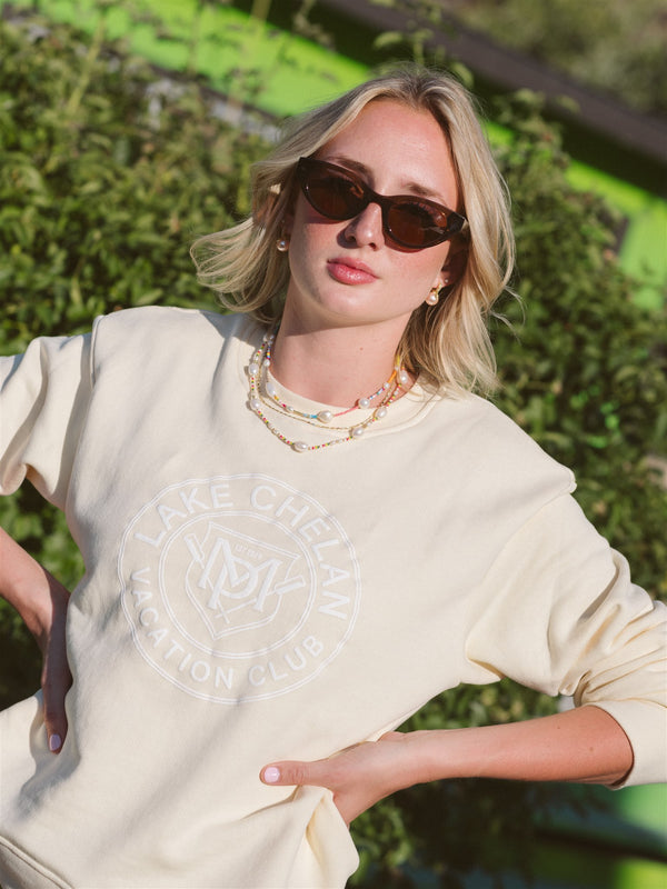 A soft, 100% cotton, French terry loopback sweatshirt with crew neck and drop shoulder for a worn-in, vintage look. The Blonde colorway features a sunkissed cream base with our white Vacation Club logo.