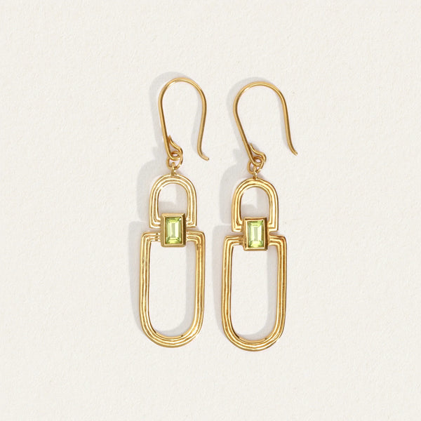 The Vault Earrings are 18k gold vermeil drop earrings adorned with radiant peridot. The statement earrings derive their name from the mirrored arches that form their foundation. Ubiquitous in Roman architecture, vaults were arched ceilings that provided structural support. Examples of this design include the Pantheon and Colosseum.
