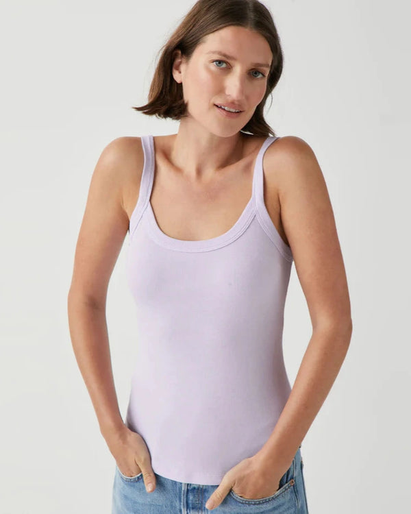 The seasonless cami tank, Vita has a scoop neck, fitted silhouette, wide binding and a shirttail hem.