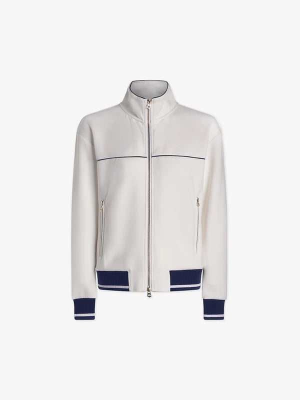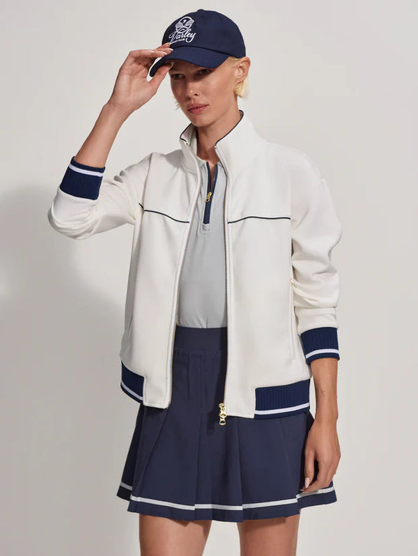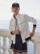 Cut to a slim boxy silhouette, this jacket features a double-ended zip, high-neck, and contrast piping details for a retro-inspired finish. Structured yet comfortable, it’s perfect for relaxing in or throwing on for an outdoor match.