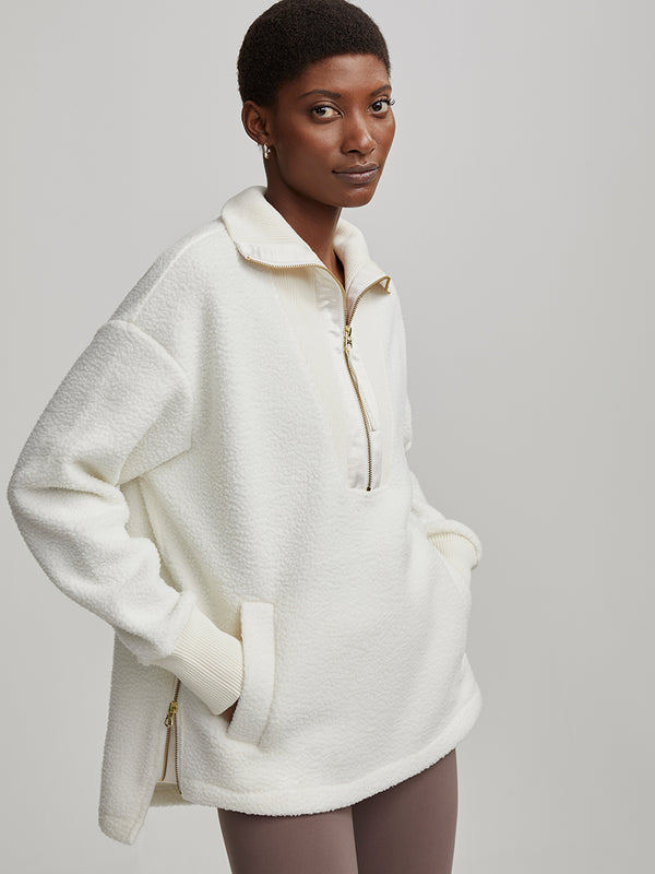 Spotlighting our 100% Recycled Plush Borg Fleece, this style is cut with a half-zip collar, ribbed cuffs and loose fit sleeves. Trademark side zip detailing and a luxe sateen trim elevate the design.