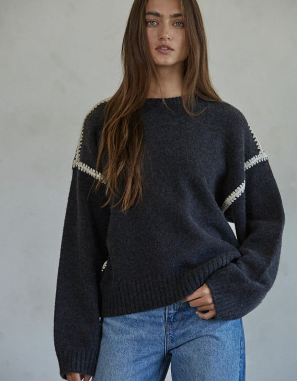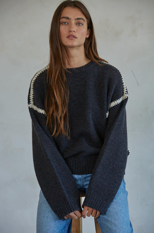 This cozy crewneck sweater features bold crochet-style contrast stitching along the shoulders and sleeves, giving it an effortless yet elevated vibe. Perfectly balanced between casual and beachy, it pairs easily with denim, skirts, or over a slip dress for year-round wear.