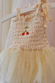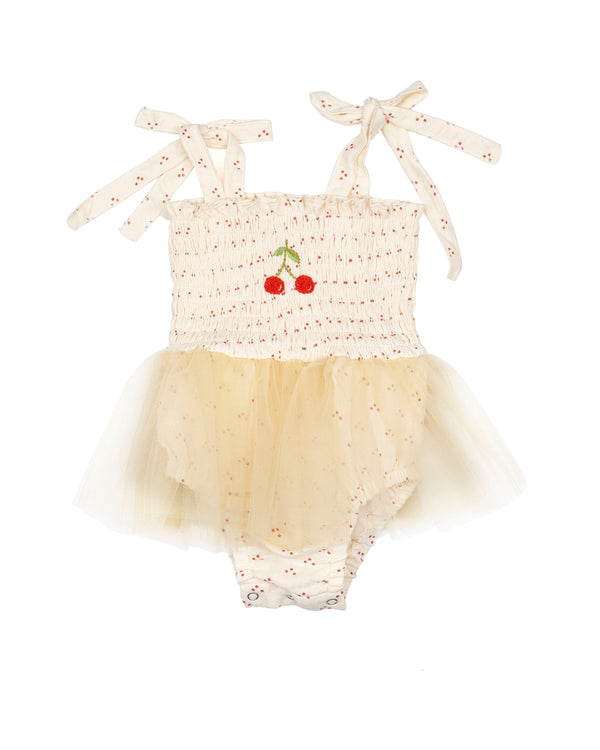 Adjustable shoulder-tie straps allow for a flexible, grow-with-her fit, while delicate red cherry motif throughout add subtle texture and whimsy. A soft, floaty tulle skirt brings gentle volume, and built-in bloomers with snap closures make it as practical as it is precious.