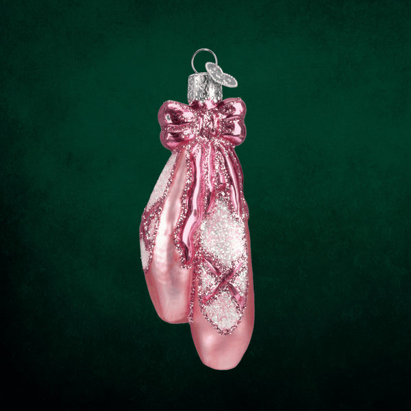 A pair of delicate pink ballet slippers tied with glittering ribbons, capturing the grace and beauty of dance. A lovely keepsake for dancers and dreamers alike.