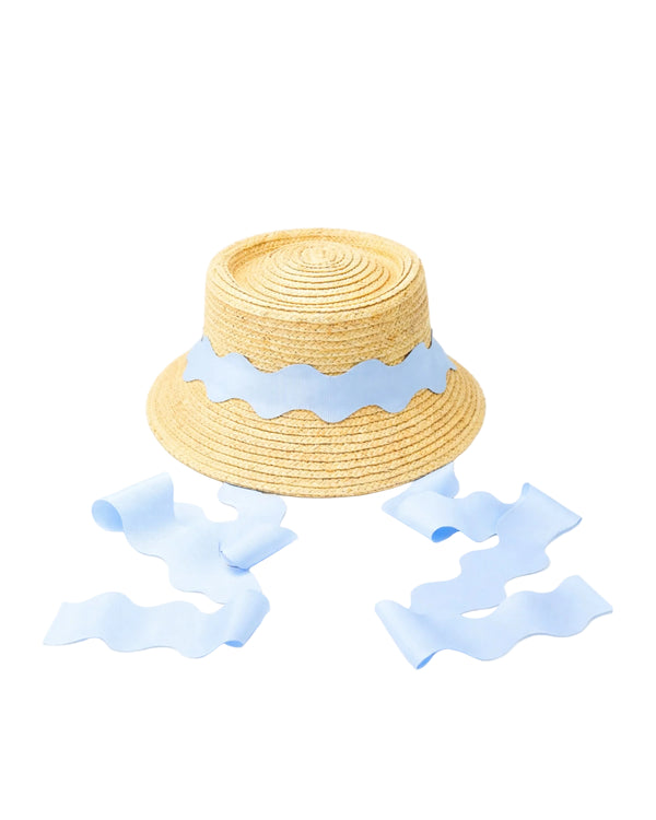 This stylish straw hat offers pretty protection from the sun. Each is integrated with a scalloped blue grosgrain ribbon in a shape that mimics the ocean’s waves to add a bit of whimsy for beach days, pool play dates, picnics, parties, and everywhere in between.