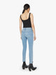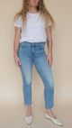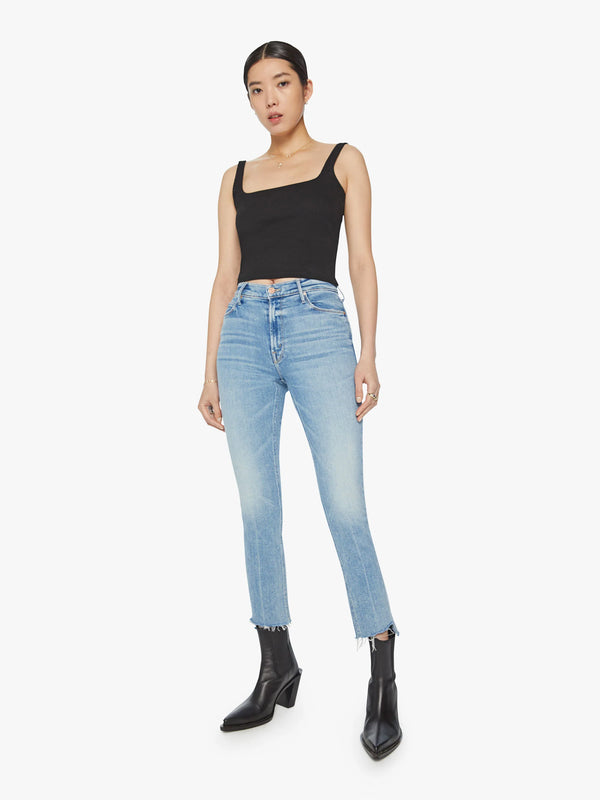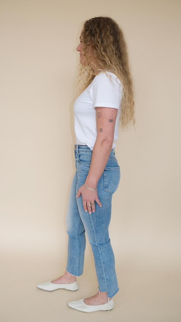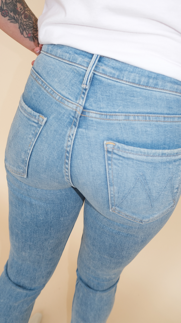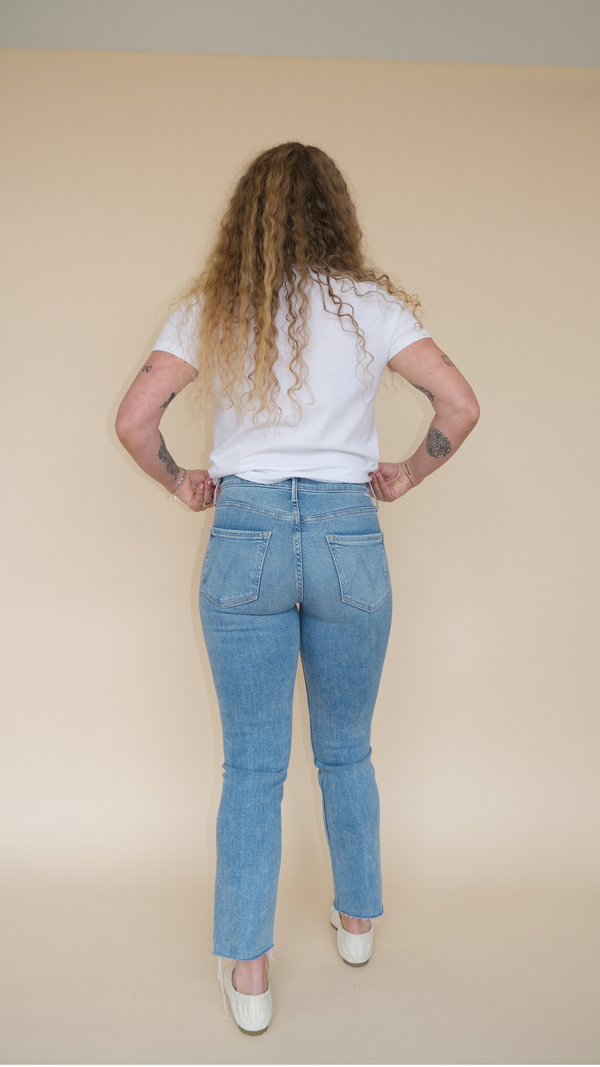 MOTHER's most popular mid-rise jean has a straight leg with an ankle-length inseam and a frayed step hem. Made from stretch denim, Ropin' N' Ridin' is a light blue wash with whiskering and fading at the knee.
